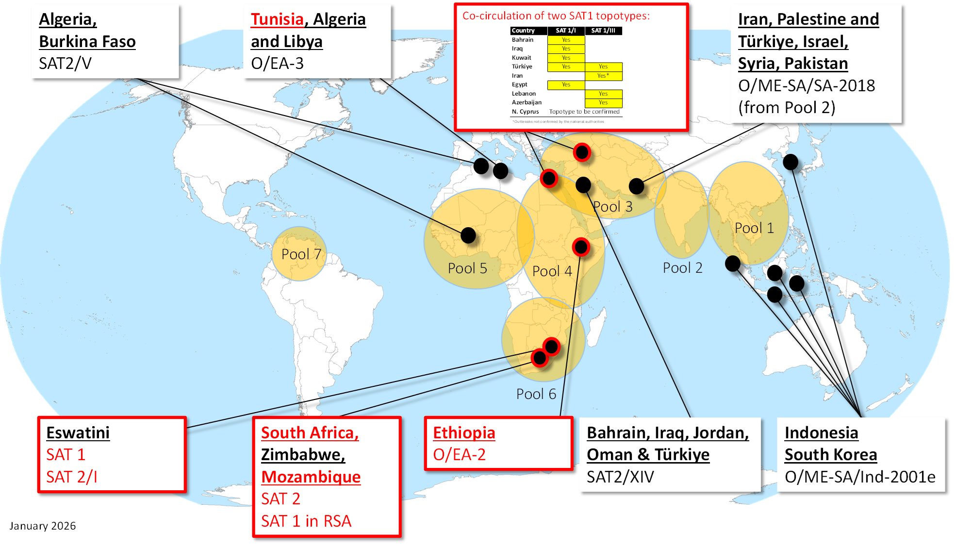 In southern Africa, new FMD outbreaks have been reported in Mozambique and Zimbabwe as well as in South Africa where the continued circulation of serotype SAT 2 has led to FMD cases being detected in Eswatini which was previously FMD-free without vaccination. In North Africa, new serotype O outbreaks have been reported in Algeria and Libya, while in Burkina Faso reports of SAT 1 require urgent confirmation by a Reference Laboratory since this would be the first time that this serotype has been detected in the country.
