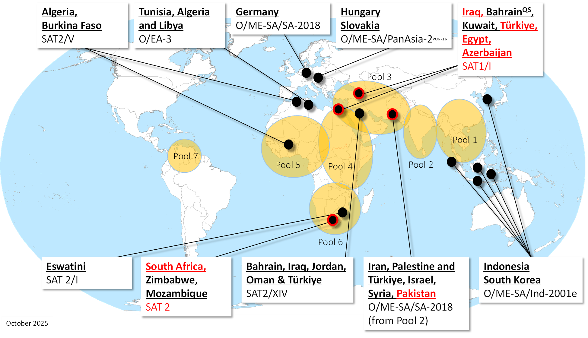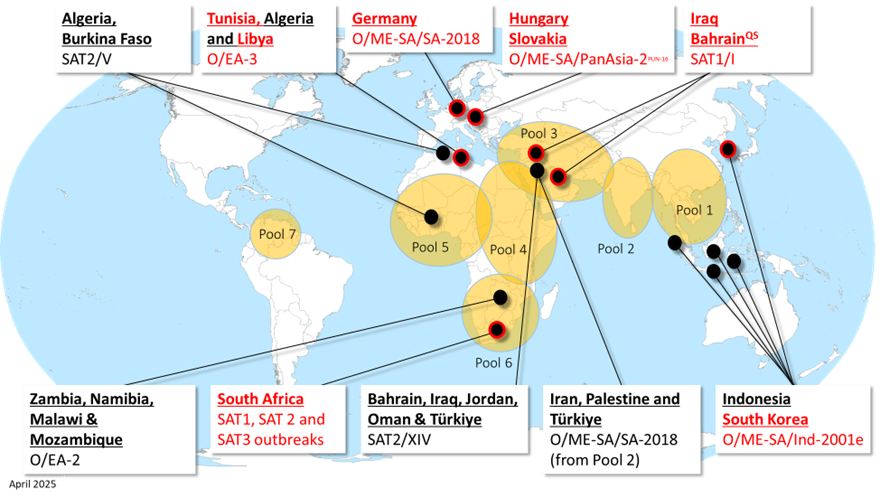 These are challenging times, where it is as important as ever to maintain networks that collate and share information about the changing patterns of risk. FMD outbreaks in Western Asia continue to be dominated by the spread of serotype SAT 1 (topotype I) viruses where cases due to this exotic lineage have been reported in Bahrain (in a quarantine station), Iraq, Kuwait and Türkiye (and Egypt – topotype has not been officially confirmed). During 2025, there has been an upsurge in FMD outbreaks reported in Türkiye, the greatest proportion of the >800 outbreaks is due to serotype SAT 1, but there are also outbreaks due to the new serotype O lineage (O/ME-SA/SA-2018;) that has been recently imported from the Indian sub-continent (https://pubmed.ncbi.nlm.nih.gov/40419097/) as well as serotype SAT 2 outbreaks, due to topotype XIV which emerged during 2022/3. Data to support the presence of the emerging O/ME-SA/SA-2018 lineage in Pakistan were presented at the GFRA meeting in October. In view of the lack of pre-existing immunity in livestock (from infection or vaccination) for the SAT 1 serotype, further spread of this exotic serotype should be anticipated. The WRLFMD is supporting countries by performing heterologous testing of candidate FMD vaccines from different suppliers, where a recent collaborative paper with AU-PANVAC provides a new approach to undertake this testing using regional reference antigens (https://pubmed.ncbi.nlm.nih.gov/40419503/).